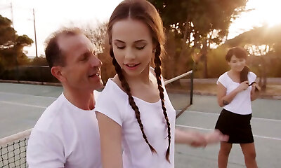 Horny trainer fucks couple of killer slim girlies after nice tennis game