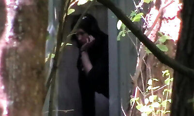 Svelte amateur gal in denim shorts pissing right in the woods