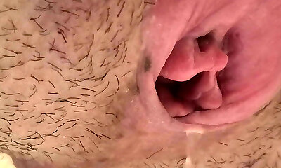 Wifey let me look at her peeing gaping pussy, for which she get a huge cum load inside. Close-up